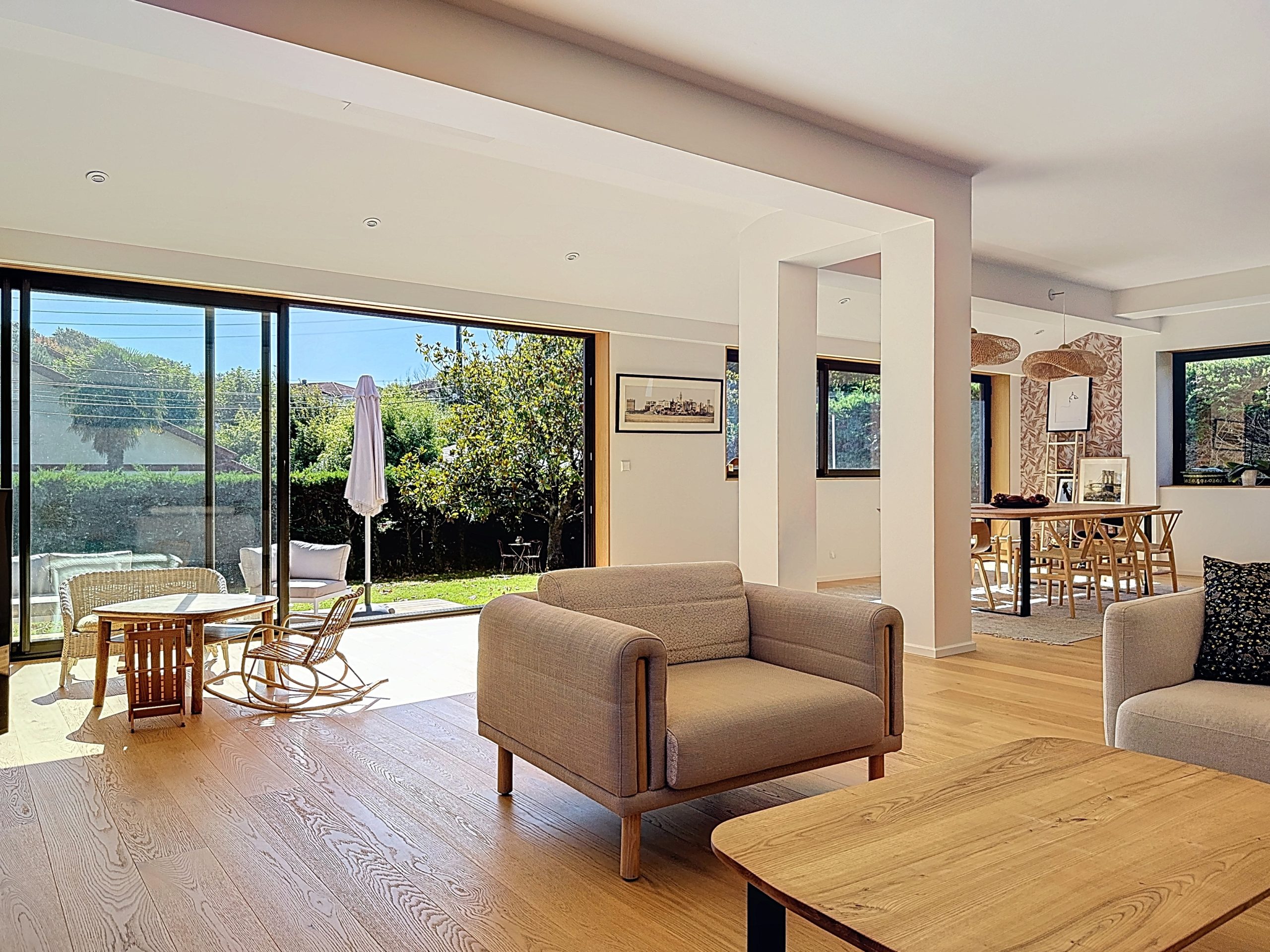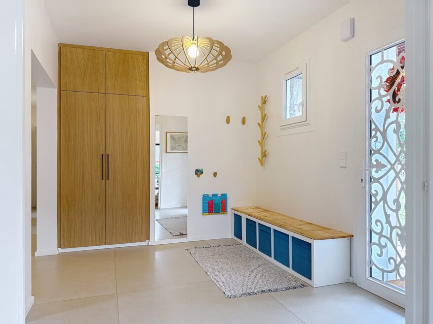 Au cœur de la maison, une entrée aménagée avec rangements mène à une superbe pièce de vie de 80 m², baignée de lumière grâce à de larges baies vitrées coulissantes. Le salon, la salle à manger et la cuisine fonctionnelle s’harmonisent parfaitement, créant un espace convivial, spacieux et chaleureux, ouvert sur l’extérieur.